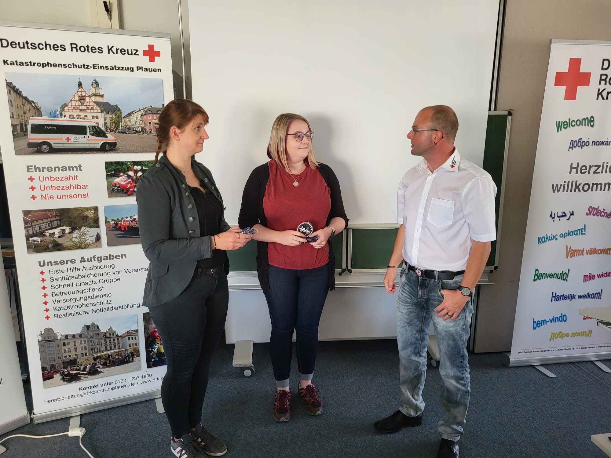 Vom Vorstandsvorsitzenden des DRK Zentrum Plauen/Vogtland e.V. wurden die Mitglieder Markus Glöckl und Erik Krutzger für 20 Jahre und Kerstin Geipel für 45 Jahre aktive Mitgliedschaft mit der Auszeichnungsspange geehrt.